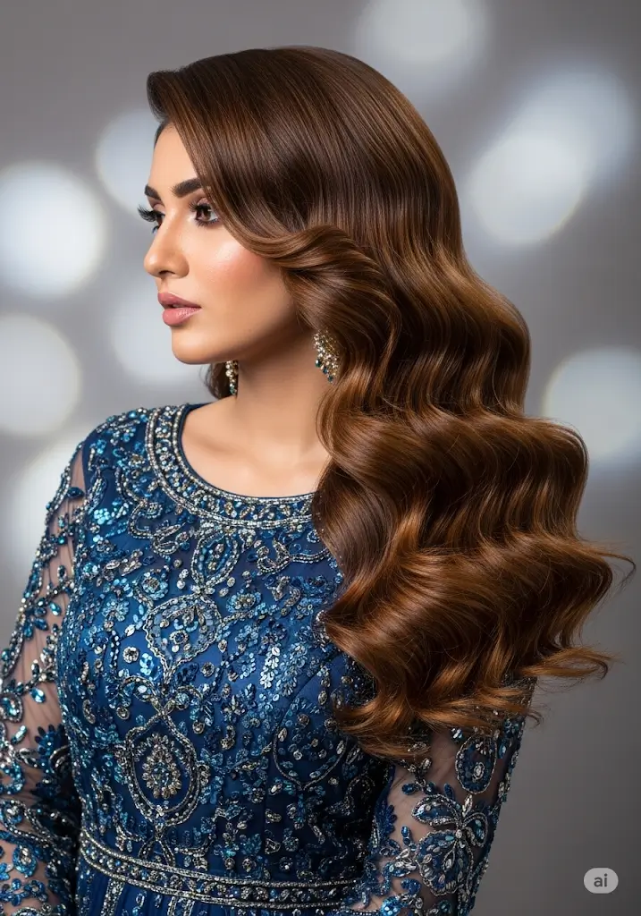 ✔ Glamorous Curls & Waves: Ek soft aur romantic look ke liye, hum mukhtalif qisam ke curls aur waves (jaise beachy waves ya Hollywood curls) create karte hain.